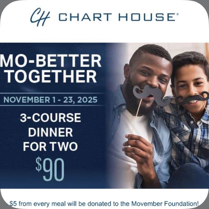 Aloha Friends and Family - The Chart House, Peohe's and Chart House Prime are working together to raise awareness for men's health. Donate directly to our team or visit your local Chart and enjoy our Mo-Better Together Dinner for 2, where $5 of every purchase goes to the Movember Foundation.